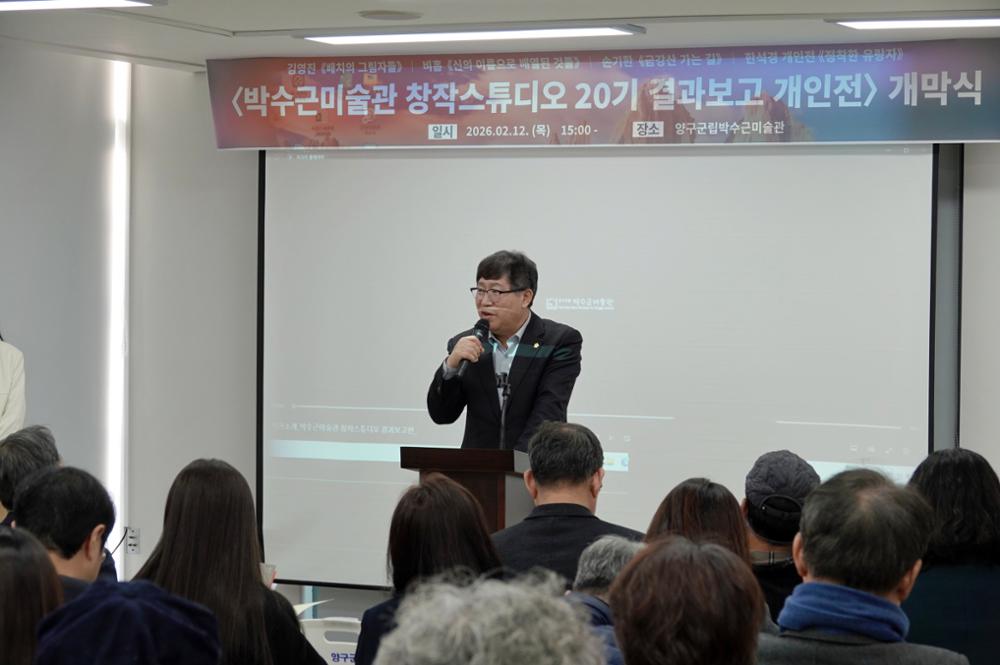양구군의회 정창수 의장, 신철우 부의장이 12일 박수근미술관 내 현대미술관 교육실에서 열린 박수근미술관 창작스튜디오 제20기 입주작가 결과보고전 전시개막식에 참석했다.