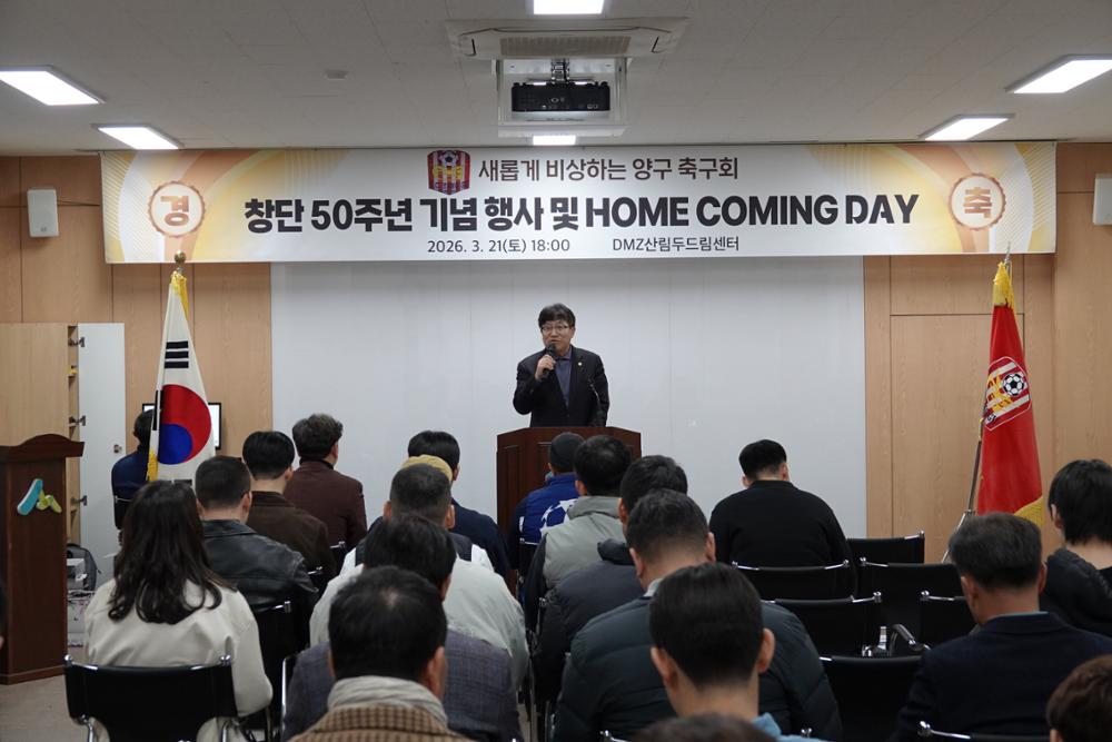 양구군의회 정창수 의장, 신철우 부의장, 조돈준 의원, 김정미 의원, 김선묵의원, 김기철 의원이 21일, 두드림센터에서 열린 양구축구회 창단 50주년 기념행사에 참석했다.