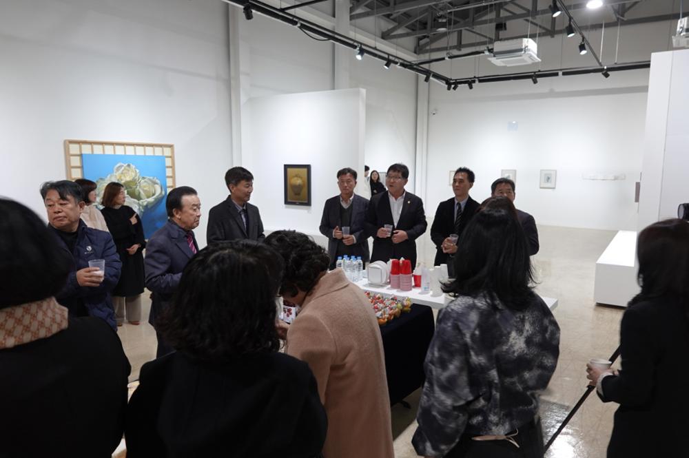 양구군의회 정창수 의장, 신철우 부의장, 김정미, 이상철 의원이 3일 버드나무 예술창고에서 열린 김형곤 개인전 '양구의 사계'에 참석했다.
