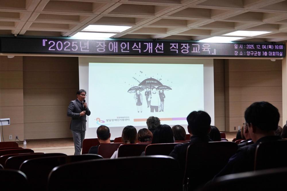 양구군의회 정창수 의장, 신철우 부의장, 김정미, 이상철 의원이 4일 군청 대회의실에서 열린 2025년 직장 내 장애인 인식개선 교육에 참석했다.