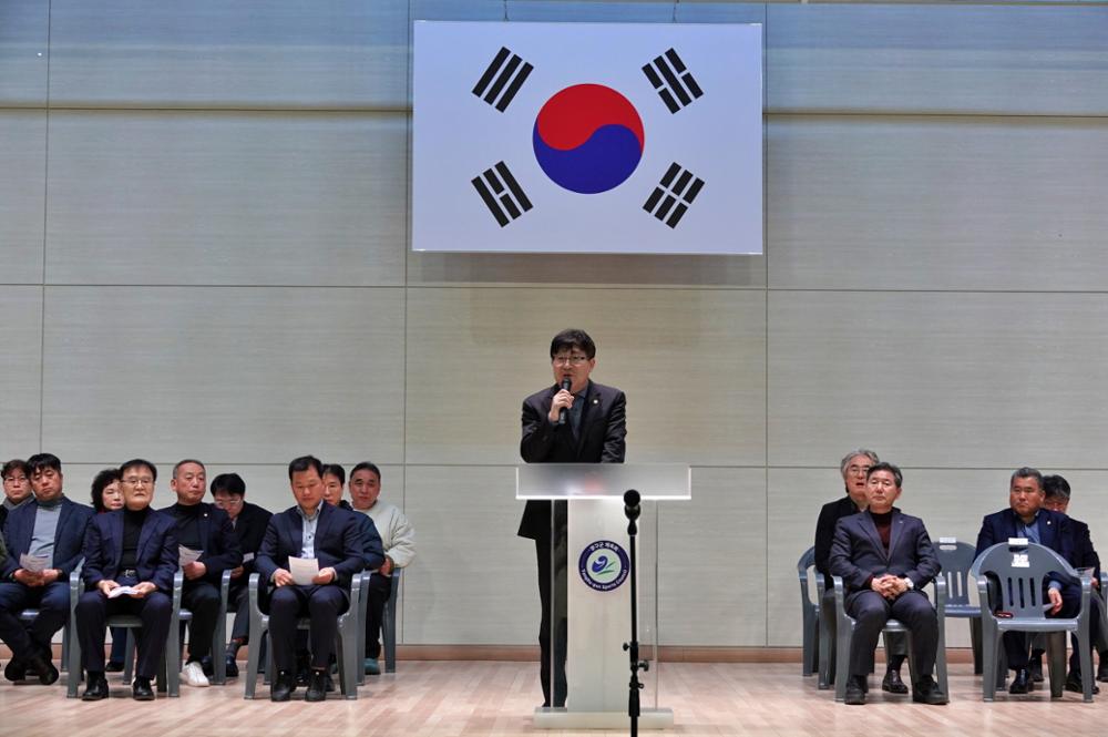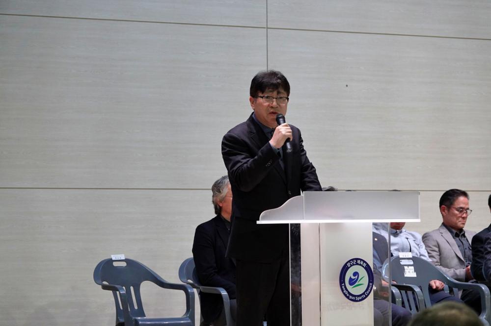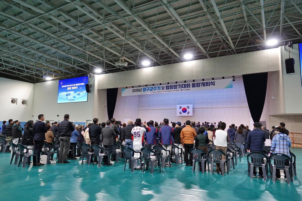 양구군의회 정창수 의장, 신철우 부의장, 조돈준, 김선묵, 김기철 의원이 21일 종합스포츠타운 다목적체육관에서 열린 2026년 양구군수기(배) 및 협회장기(배) 통합개회식에 참석했다.