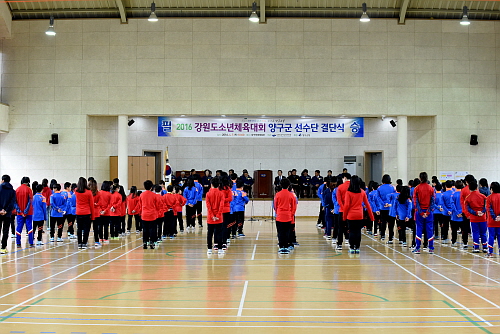 김철 의장은 4월 7일 양구초체육관에서 열린 2016 강원도소년체육대회 결단식에 참석하여 임원 및 선수들을 격려하였다.
