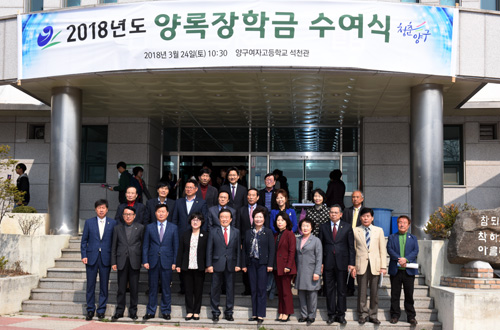 최경지 의장과 군 의원들은 3월 24일 석천관에서 열린 2018년도 양록장학금 수여식에 참석하여 장학증서를 수여하고, 의장은 축사와 함께 장학생들을 격려하였다.