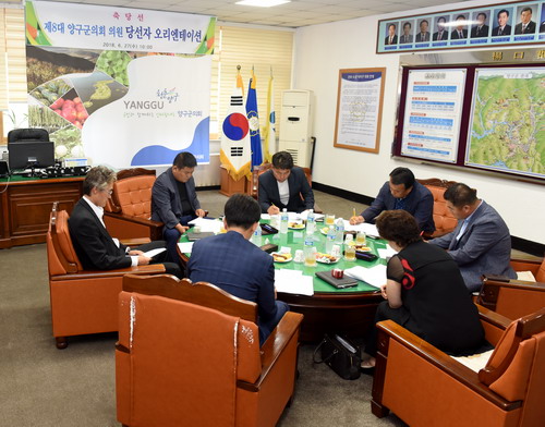 6월27일 오전10시 의장실에서 6.13지방선거에서 당선된 양구군의원 7명과 의회사무과 직원이 참석한 가운데 사무과장 주관으로 제8대 의원당선자 오리엔테이션을 열어 의정운영 주요사항을 안내하고, 원구성 등 현안사항을 협의하였다.