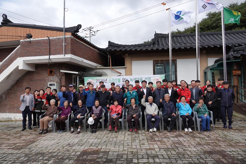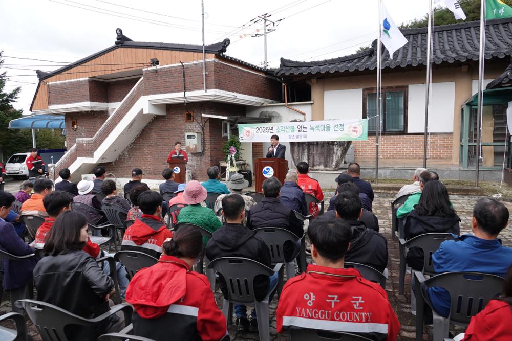 양구군의회 정창수 의장, 조돈준, 김선묵 의원이 16일 팔랑1리 마을회관에서 열린 2025년 소각 산불없는 녹색마을 현판식에 참석했다.