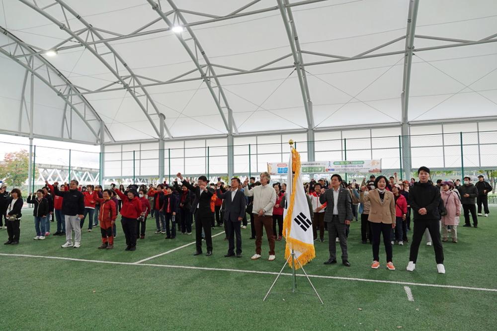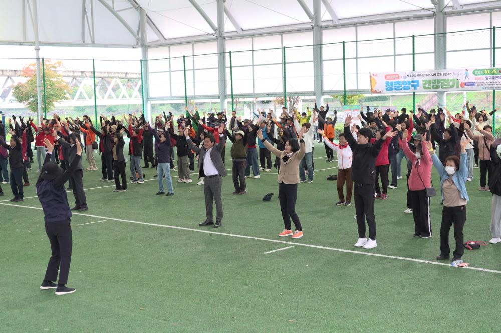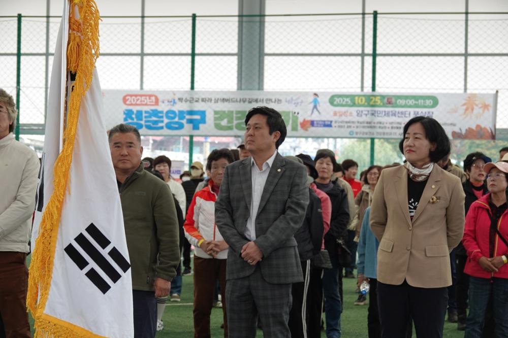 양구군의회 정창수 의장, 신철우 부의장, 조돈준, 김정미, 김기철, 이상철 의원이 25일 국민체육센터 풋살장에서 시작되는 2025년 청춘양구 건강걷기 행사에 참석했다.