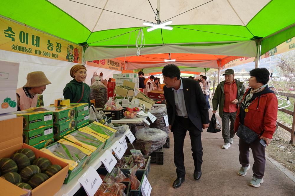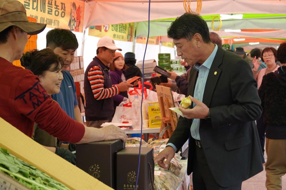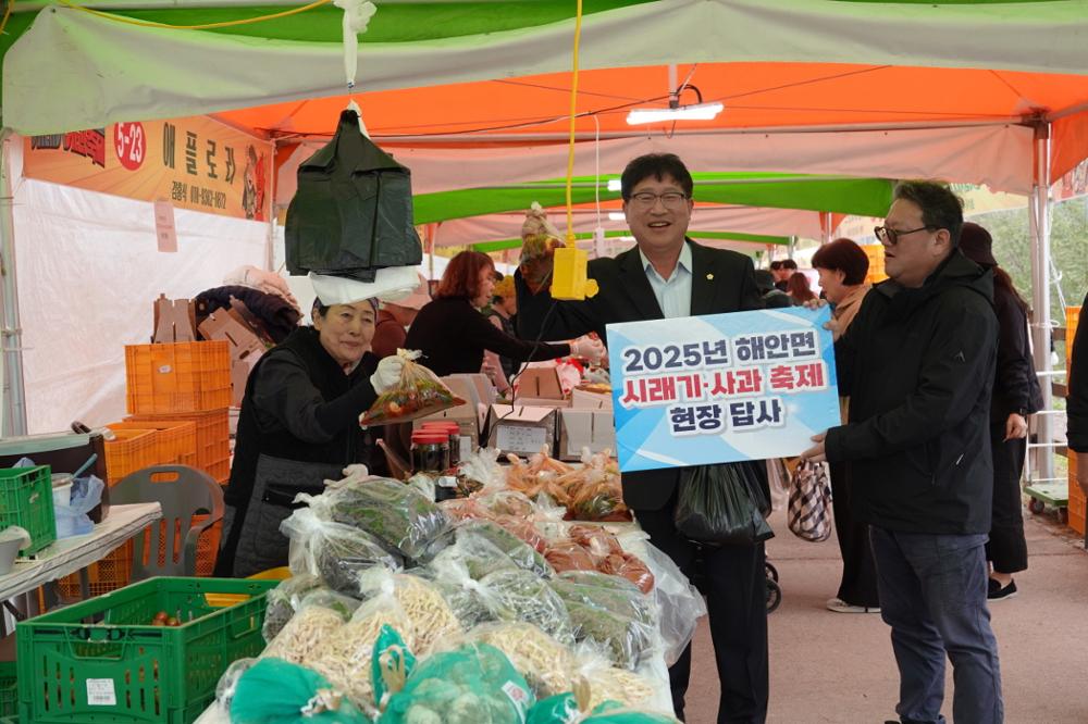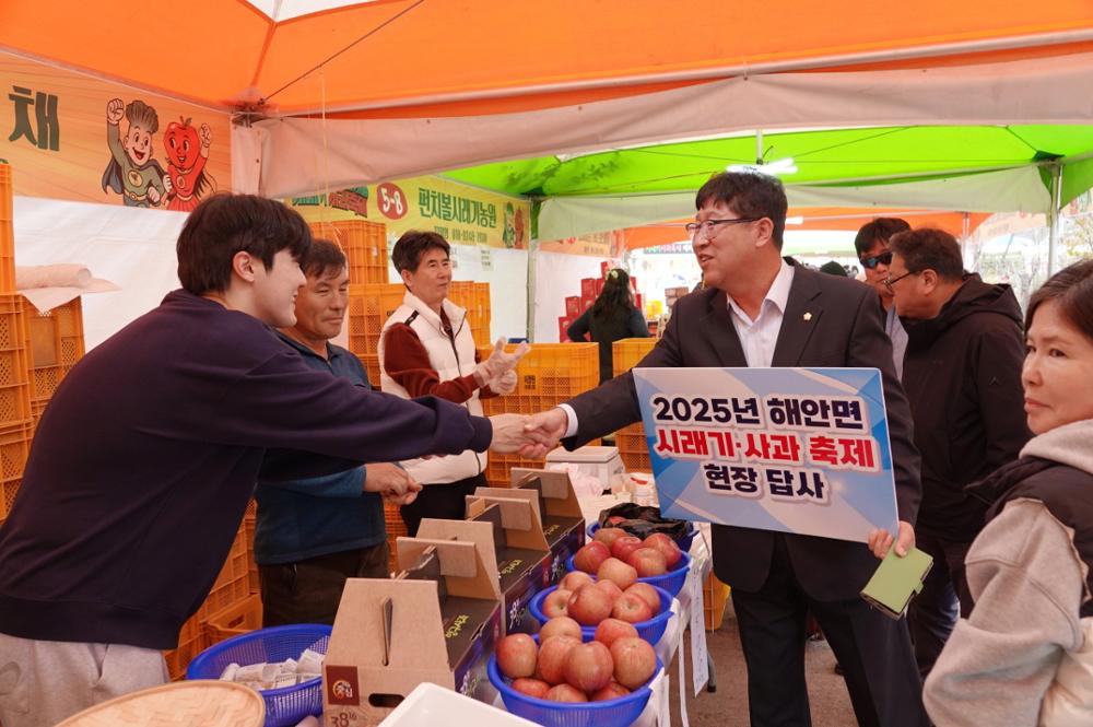 양구군의회 정창수 의장, 조돈준, 김선묵, 이상철 의원이 31일 해안면 펀치볼힐링하우스에서 열린 2025 청춘양구 펀치볼 시래기 사과축제 현장을 체험하고 둘러봤다