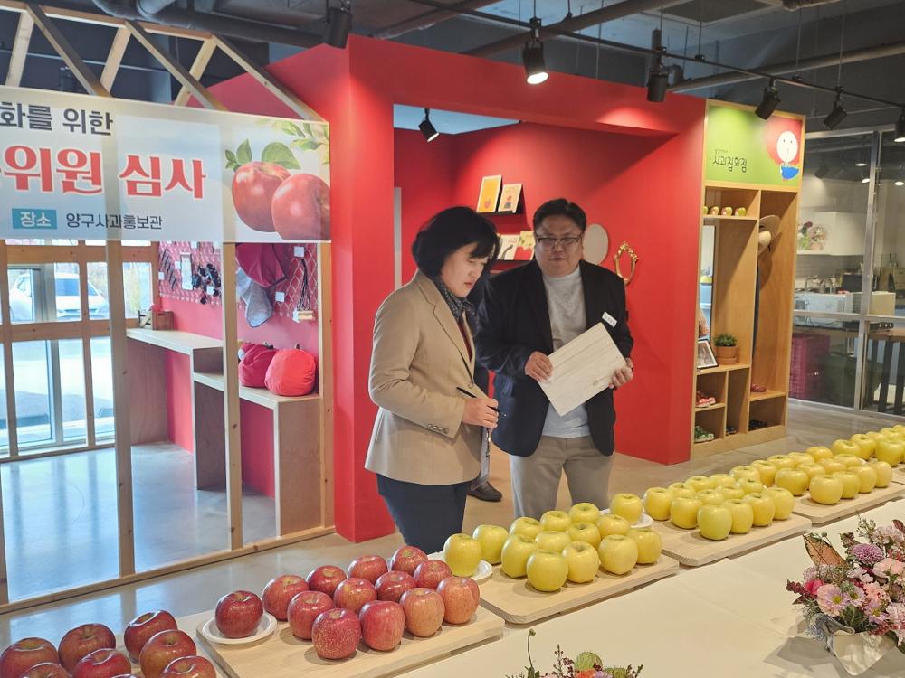 양구군의회 김정미, 김선묵 의원이 13일 양구사과 홍보관에서 열린 2025년 우수사과(부사부문) 품평회에 참석했다.