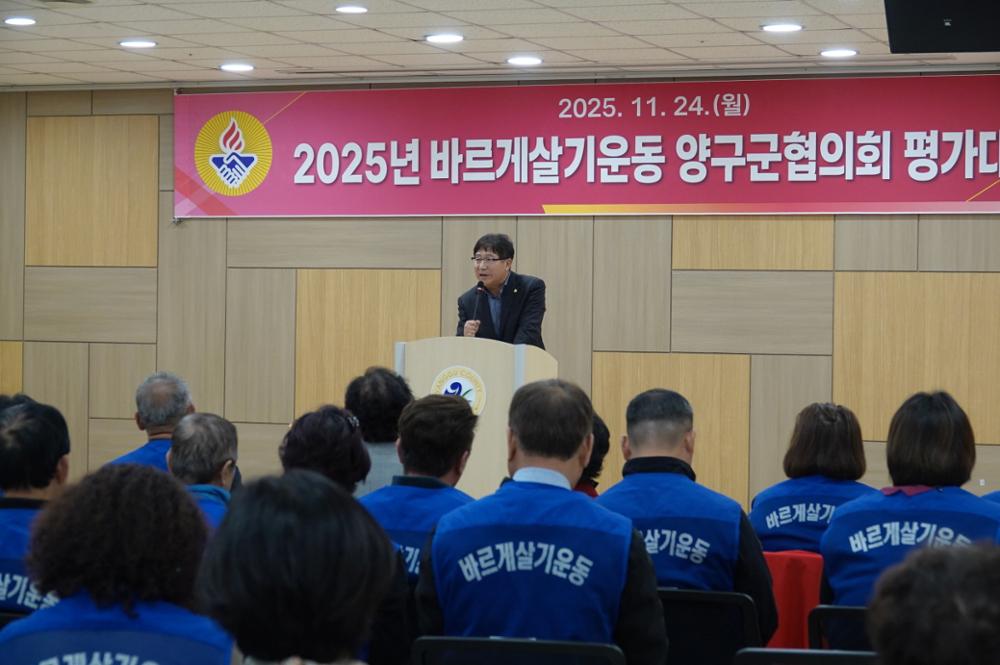양구군의회 정창수 의장, 신철우 부의장, 조돈준, 김정미, 김선묵, 김기철, 이상철 의원이 24일 양구문예회관에서 열린 2025년 바르게살기운동양구군협의회 평가대회에 참석했다.