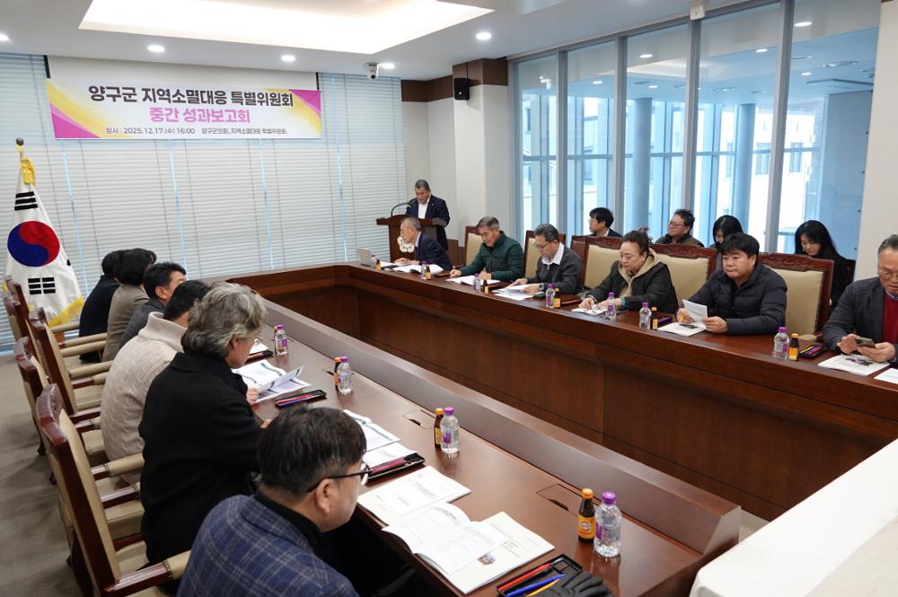 양구군의회 정창수 의장, 신철우 부의장, 조돈준, 김정미, 김선묵, 김기철, 이상철 의원이 17일 의회 소회의실에서 열린 양구군 지역소멸대응 특별위원회 경과 및 성과보고회에 참석했다.