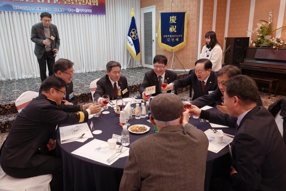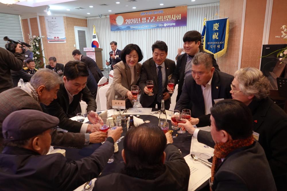 양구군의회 정창수 의장, 신철우 부의장, 조돈준, 김정미, 김선묵, 김기철, 이상철 의원이 8일 KCP호텔에서 열린 2026년 양구문화원 신년인사회에 참석했다.