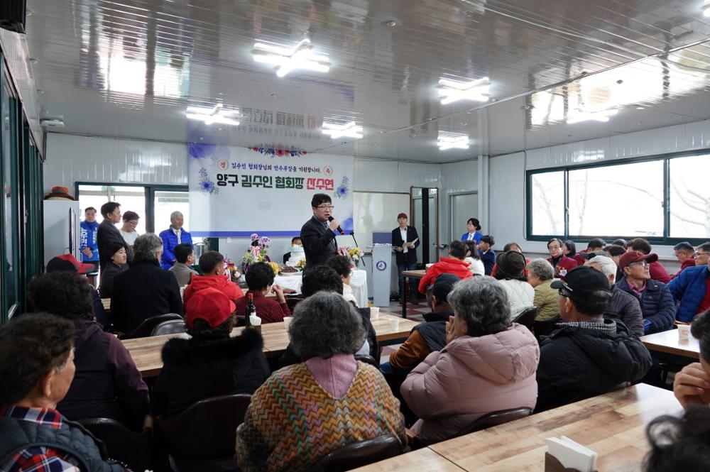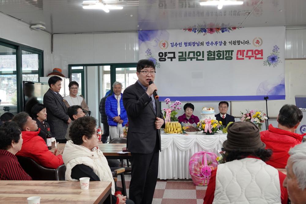 양구군의회 정창수 의장, 신철우 부의장, 조돈준, 김정미, 김선묵, 김기철 의원이 11일 양구군 게이트볼장에서 열린 김수인 협회장 팔순기념 친선 게이트볼대회 개회식에 참석했다.